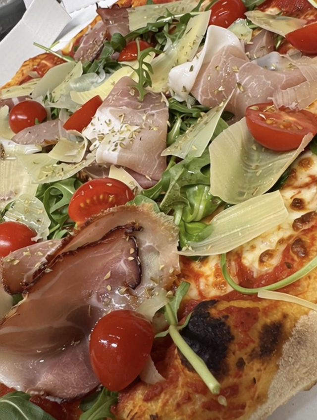 tomate, mozzarella, roquette, jambon de dinde, tomate cerise, huile d'olive, origan